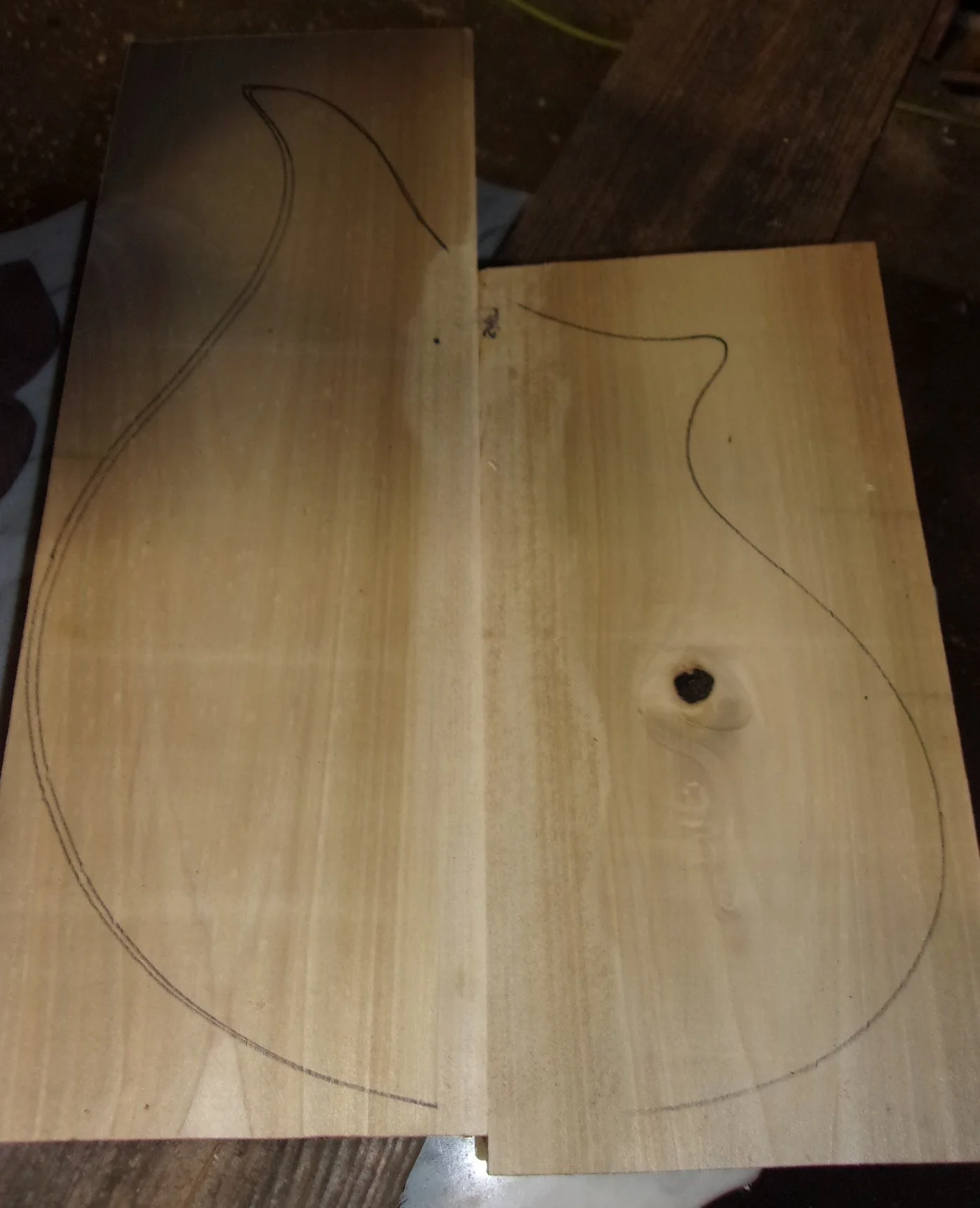 Style B lined fretless “craftsman’s choice” fancy - dark with light accents and gold hardware. Koa on mahogany with ebony and turquoise; will get stained dark and buffed back. (Final sanding and semi-scroll detail)