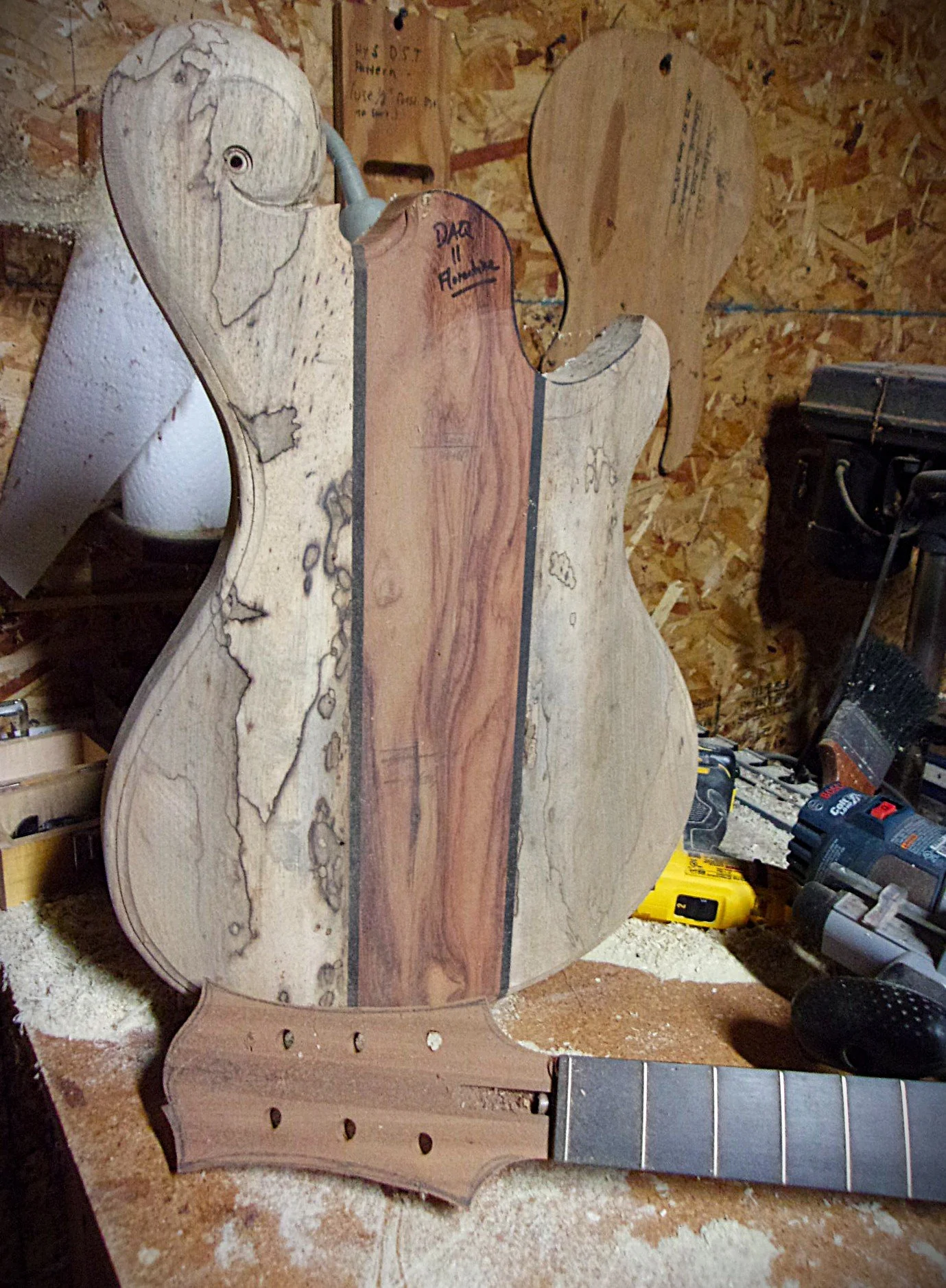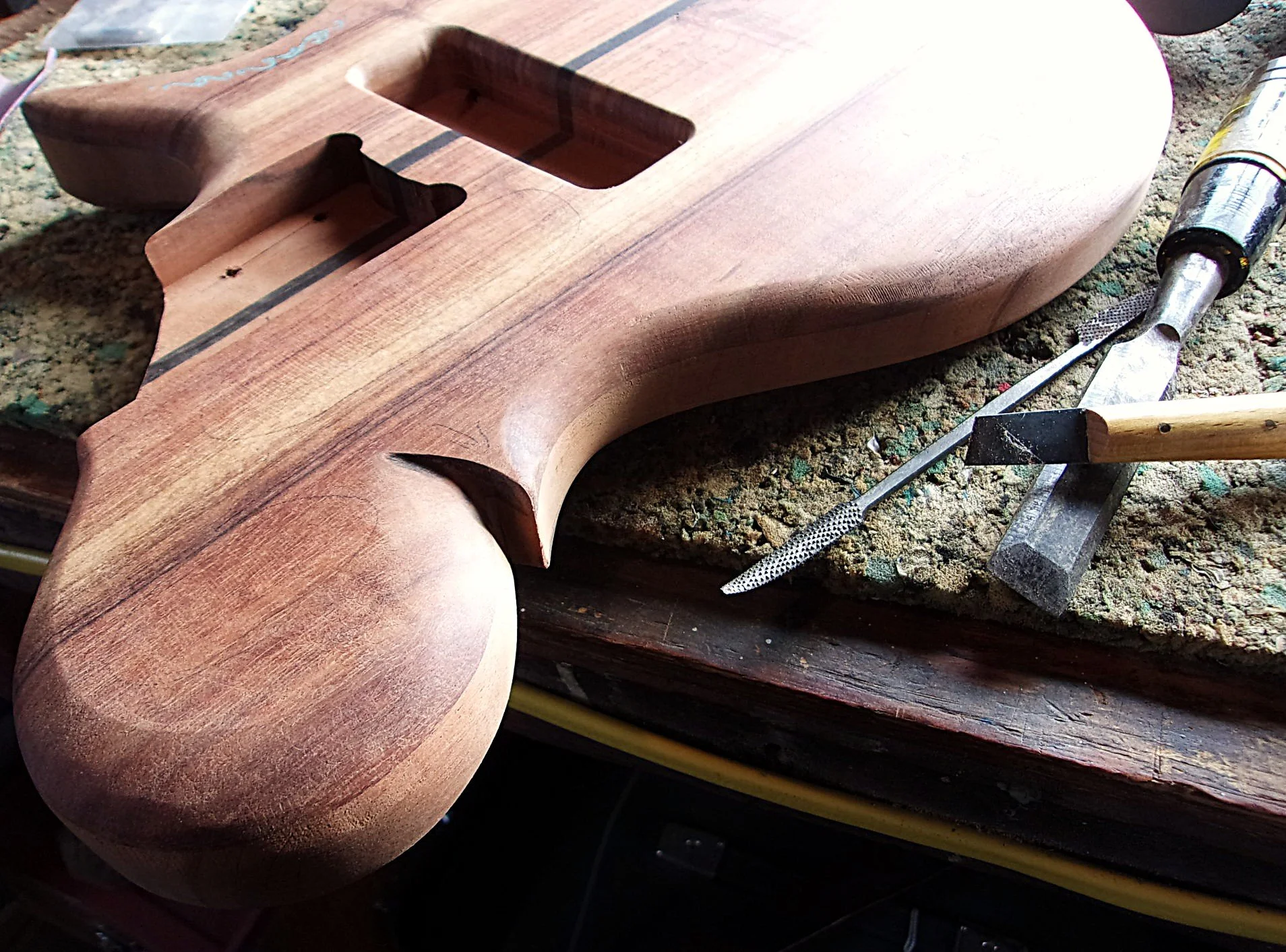 (Final assembly - flatwounds are on their way, and I need to remake the walnut control plate… then wiring and strings and setup. Will ship in early January.)