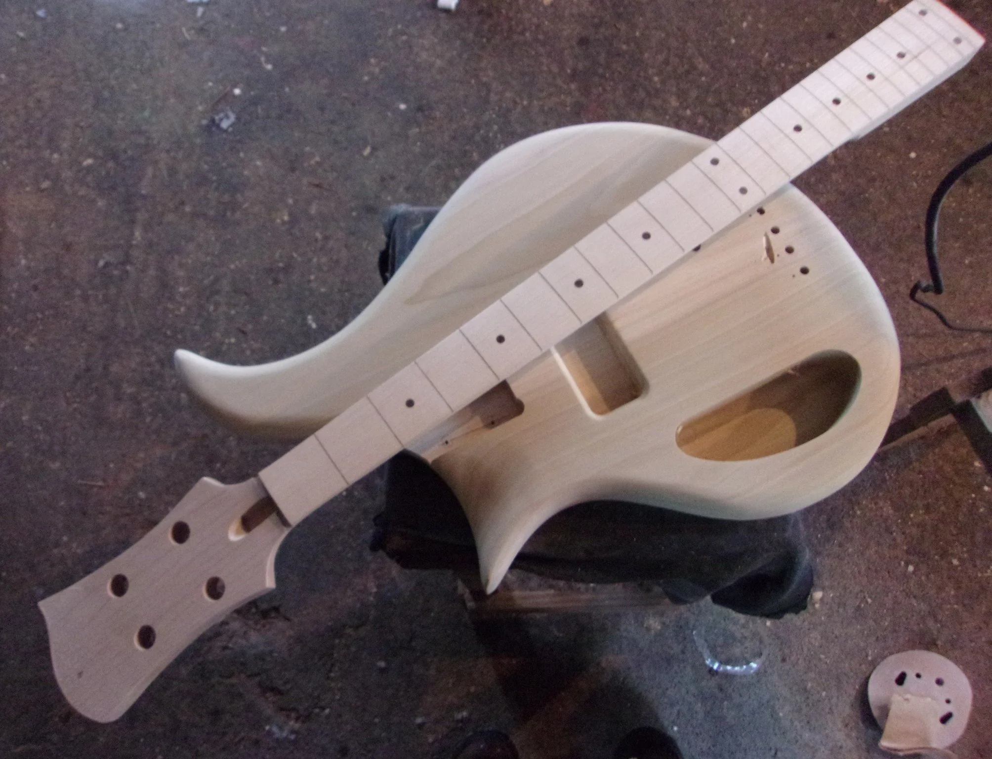 In the workshop here, you can always click at the top on “Client” to peek at what is being worked on or in line for its next step. This update we’ll look at #2508, a VERY custom Sport bass. (Everybody say it out loud together: “How custom IS it?”) OK… lefty lined fretless maple board 29” scale BEAD-tuning with a one-off slightly recurved body to visually and physically balance the longer neck. Other than that, completely stock! Approached right, by an easy-going client, I do occasionally veer into out-there territory. When I was making the Birdsong basses, I remember combining a short-scale Sadhana with features of a Rickebacker; the bass guitar version of mating a Chihuahua and a Great Dane. Somehow, with a little off here and moving this and that halfway and such, you make it work like it was meant to be. It’s fun but it does take A LOT of time vs. a standard model there are jigs and templates for, and you know where to stand to drill that hole and how everything’s going to work. Watch this one come together over the next month or so, it’ll be something!