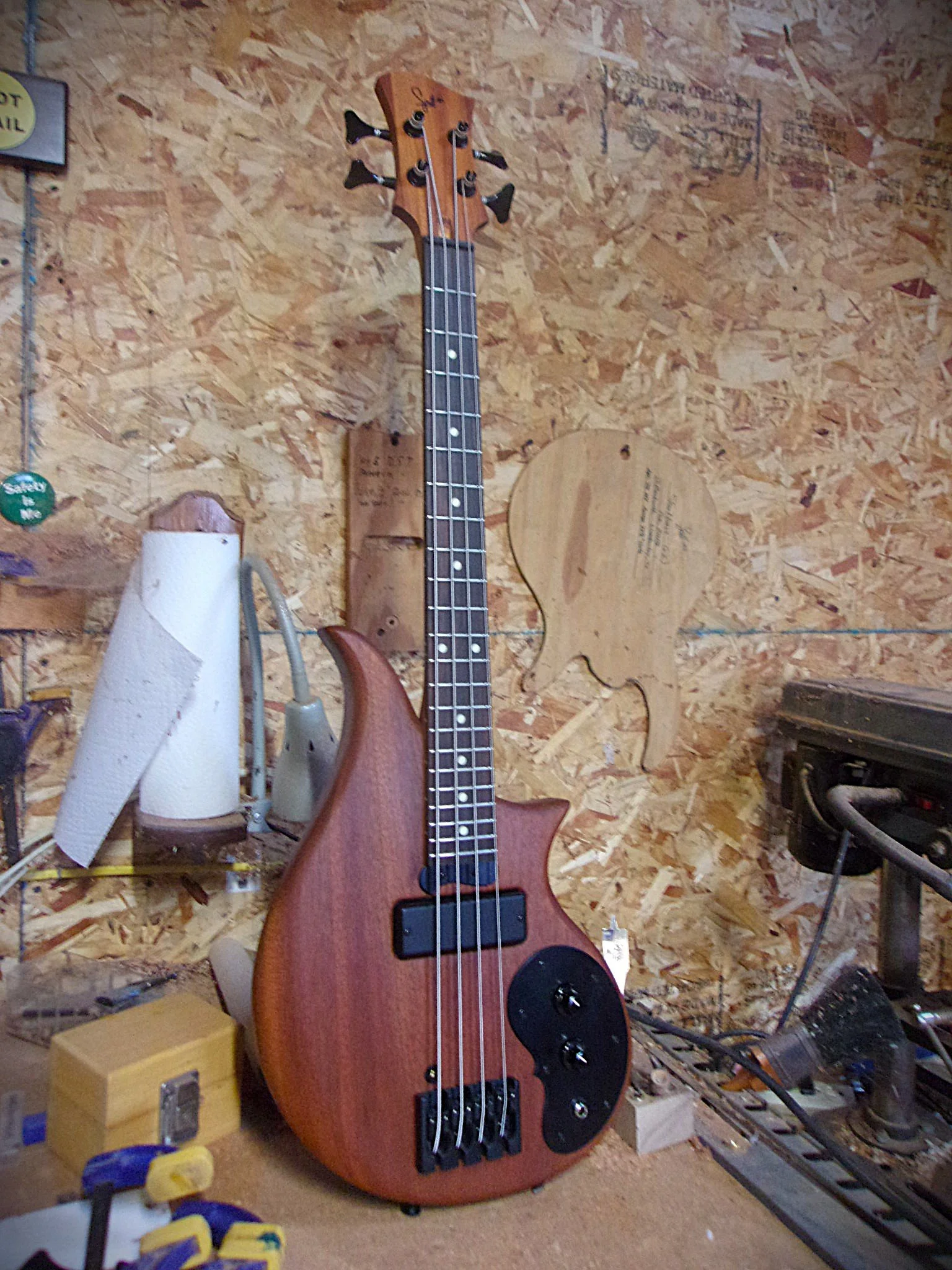 Suggested strings are D’Addario short scale sets #EXL 170 S (nickel wound) or #ECB 81 S (flatwounds). The E string goes through-the-body beginning with the front and around and up through. This affects the behavior of such a low string for such a short scale and helps a lot. Designed and first used on the B string of 5-string 31” scale Birdsongs, DST (“Double String Through” - no fancy hype name on the patent, LOL) has been used on the E of all the 25.5” scale basses we offered and I now offer. When stringing, you want 2-3 (E) to 4-5 (on the thinner strings) wraps around the tuner shaft. cut the E at just past headstock end, insert end into tuner shaft hole, gently bend over and wrap for 3. A, cut a couple of inches past the headstock end and do the same for around 4. D, same. G, go about an inch past the headstock and you’ll get about 5. This’ll simply give you consistent angling behind the nut. However you do it will likely work, but this is how I it was done on my workbench. Stretch and retune multiple times after restringing.
